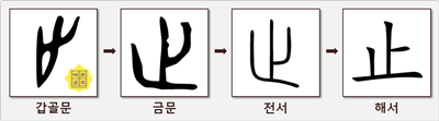 또는, 초목의 싹이 돋아날 때의 뿌리 부분의 모양을 본뜬 글자. '발'ㆍ'뿌리'라는 뜻이었으나, 그 뜻이 바뀌어 '그침'을 뜻하게 되었습니다.