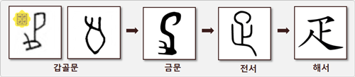 : 사람의 허벅다리 또는 무릎뼈에서 발가락 끝까지의 모양을 본뜬 글자.