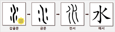 또는, 시냇물이 흐르고 있는 모양을 본뜬 글자. 글자의 가운데 곡선은 큰 물줄기를, 좌우의 짧은 곡선은 주변의 물을 표현하고 있습니다.