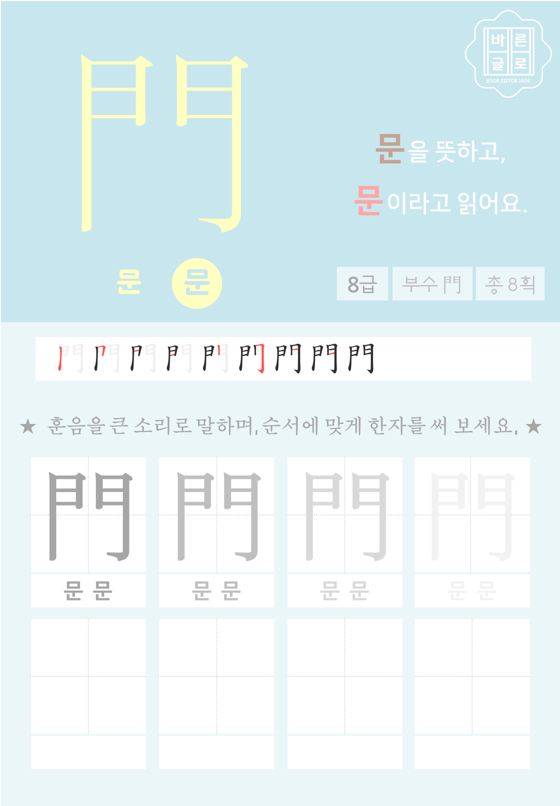 ※ 한자 급수 카드와 한자 쓰기 연습장에 나오는 한자의 대표 훈음, 필순, 쌍점은 한자능력검정회가 제시한 것을 기준으로 하였습니다.