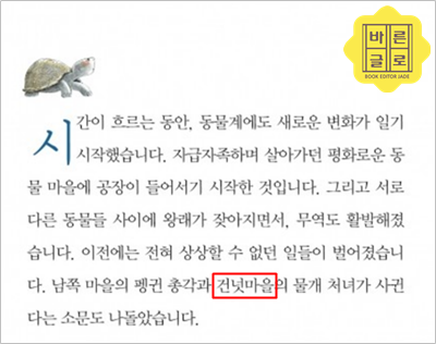 첫 번째 자료에는 '건넌 마을', 두 번째 자료에는 '건넌마을' 그리고 세 번째 자료에는 '건넛마을'로 적혀 있습니다. 이 가운데 바른 표기는 무엇일까요?