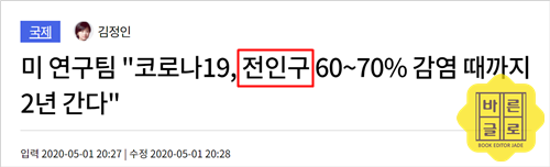 그리고 세 번째 자료에는 '전 인구', 네 번째 자료에는 '전인구'로 적혀 있습니다. 앞서, 관형사 '전'은 그 뒤에 오는 말과 띄어서 쓴다고 했으므로, 세 번째 자료와 같이 '전 인구'로 적어야 바르겠지요?
