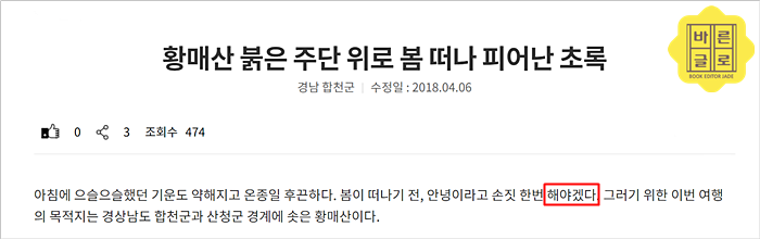 첫 번째 자료에는 '해야 겠다', 두 번째 자료에는 '해야겠다'로 적혀 있습니다. 어떤 것이 바른지 살펴볼까요?