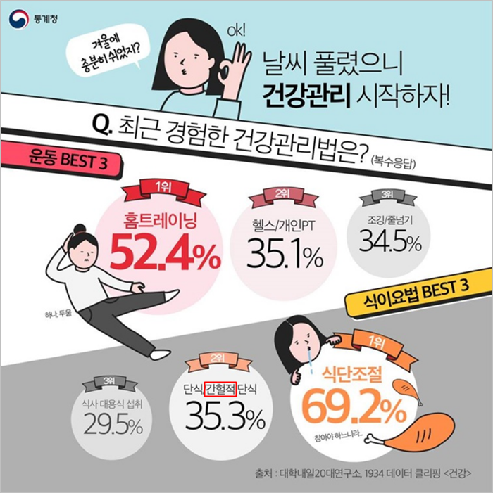 요즘 인기 있는 다이어트 방법으로, 일정한 시간을 정해 놓고 정해진 시간 안에만 음식을 섭취하는 '○○○ 단식'을 실천하는 분들이 많으신데요. '○○○'에 들어가는 말은 무엇일까요?