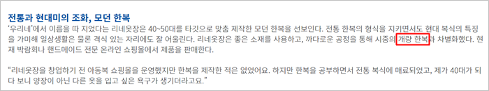 한편, 『한국민족문화대백과사전』에서는 '개량 한복'과 '생활한복'은 출현하게 된 배경이 다르다고 설명하고 있으므로, 참고해 보세요.